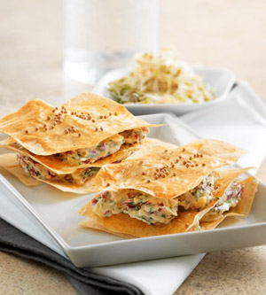 Zubereitung: 1 Strudelteig in 24 Stücke von je ca. 5 × 9 cm schneiden, auf ein mit Backpapier belegtes Blech legen, mit Eiweiss bestreichen. Senf- körner darüberstreuen. Backen: ca. 3 Min. in der Mitte des auf 200 Grad vorgeheizten Ofens. Herausnehmen, auf einem Gitter auskühlen. 2 Mostbröckli fein schneiden, Appenzeller und Peperoni in Würfeli, Kerbel fein schneiden. Alles mit dem Frischkäse, dem Senf und 2 EL Wasser verrühren, würzen. Masse in einen Spritzsack mit glatter Tülle (ca. 12 cm Ø) geben, auf 16 Teigstücke verteilen. Je zwei davon aufeinandersetzen, mit den restlichen Teigstücken bedecken. 3 Millefeuille auf Teller anrichten. Essig und Öl verrühren, würzen, mit den Sprossen vermischen, zu den Millefeuille anrichten. Mostbröckli durch Bündnerfleisch ersetzen. |