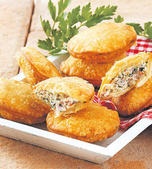Zubereitung: Ricotta und Ei verrühren, Schinken, Tomaten und Petersilie daruntermischen, würzen. Einen Teig entrollen, mit wenig Ei bestreichen. Ricottamasse zu 15 baumnussgrossen Kugeln formen, auf dem Teig verteilen. Den zweiten Teig darüberlegen, leicht andrücken, dabei eingeschlossene Luft heraus- drücken, mit einem Ausstecher (ca. 7 cm Ø) Rondelle ausstechen, Teigränder gut andrü- cken, Fravioli zugedeckt ca. 30 Min. kühl stellen. Halb schwimmend backen: Einen Brattopf ca. 3 cm hoch mit Öl füllen, heiss werden lassen, Hitze reduzieren. Fravioli por- tionenweise bei mittlerer Hitze beidseitig je ca. 3 Min. halb schwimmend goldbraun backen. Herausnehmen, auf Haushaltpapier abtropfen. Ravioli ca. 1 Tag im Voraus zubereiten, auf eine mit Backpapier belegte Platte legen, zugedeckt im Kühlschrank aufbewahren. |